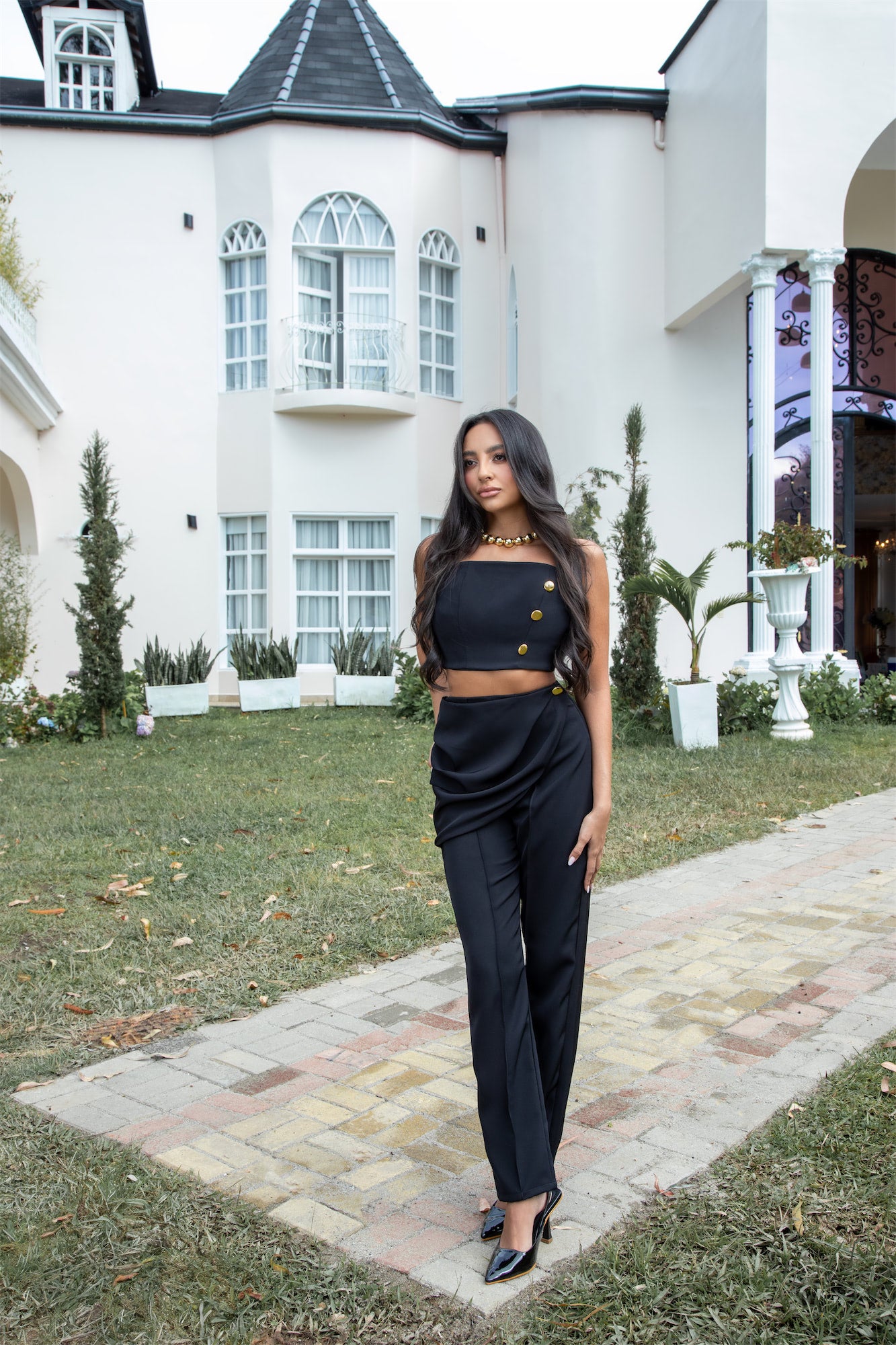 Los Slate Pants reinventan el pantalón clásico con un enfoque escultural y detallado. De talle alto y corte levemente cónico, presentan pinzas que definen la silueta y una sobrefalda drapeada que cae desde la cintura, aportando dinamismo y volumen al conjunto.