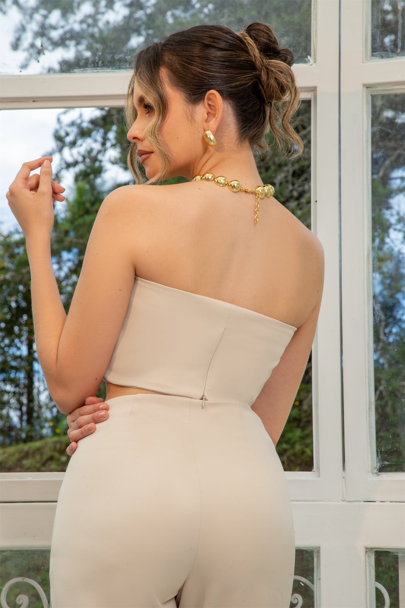 El top enmarca el torso con líneas depuradas y modernas, mientras que los pantalones estilizan la figura con pinzas definidas y un detalle drapeado que aporta movimiento y profundidad. Ideal para eventos formales o estilismos urbanos elevados, el Slate Set es una propuesta versátil y poderosa para una mujer que domina el equilibrio entre minimalismo y carácter.