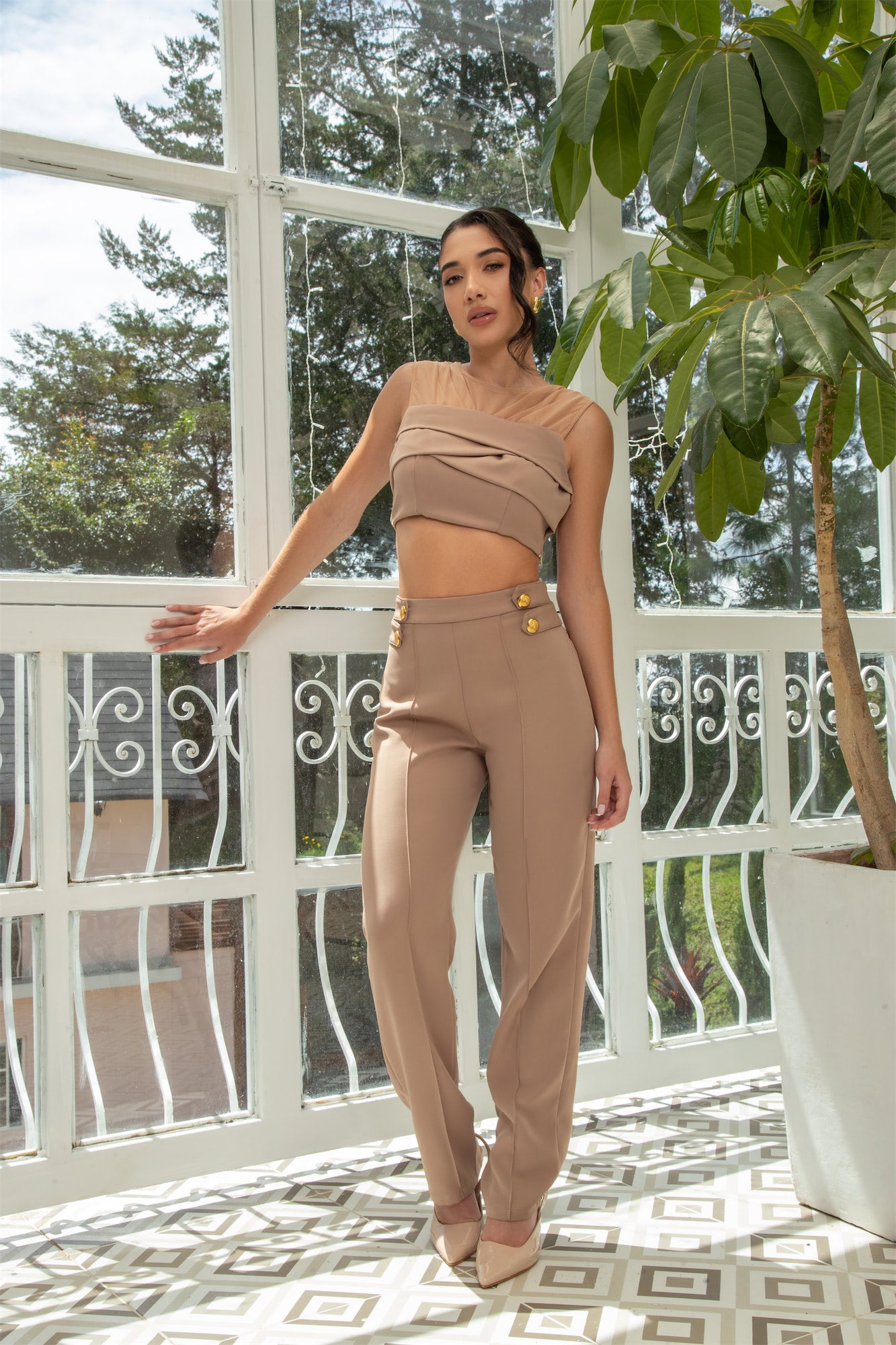 El pantalón de cintura alta, con pinzas marcadas y detalles de hebilla doble, alarga la figura y aporta un aire refinado de inspiración sartorial. Un look perfectamente equilibrado entre poder y sensualidad, ideal para cenas sofisticadas o eventos urbanos con dress code elevado.